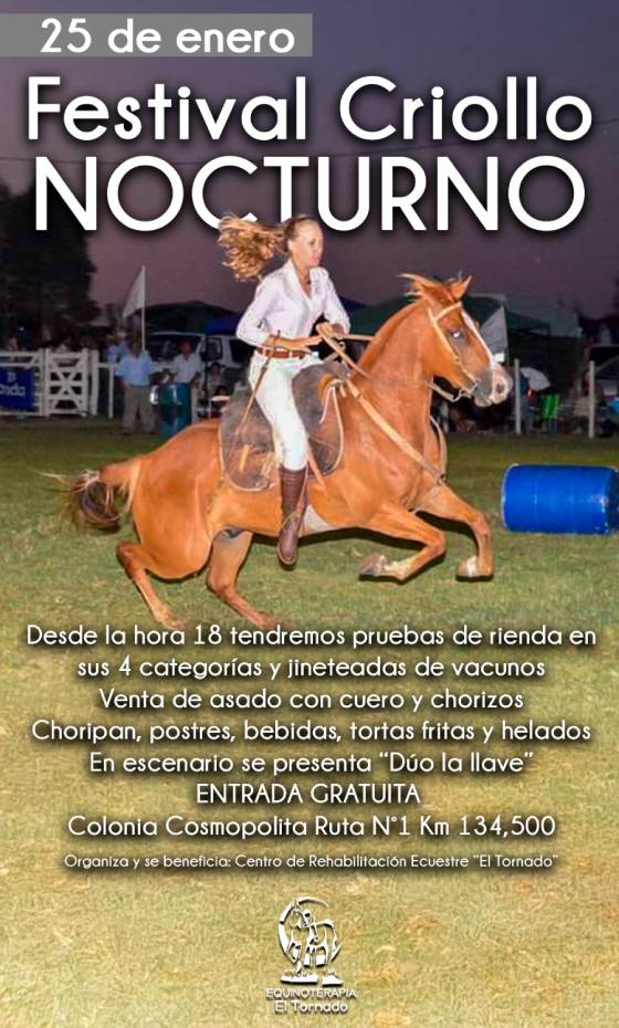 El Centro de Rehabilitación Ecuestre “El Tornado”, organiza y se beneficia con el 11º FESTIVAL CRIOLLO NOCTURNO.